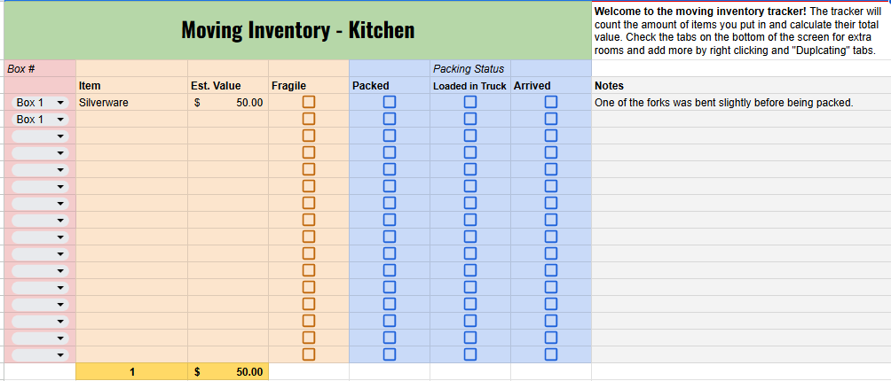 • Use a tool like our Moving Inventory Tracker or a physical notebook to keep track of every item you pack.